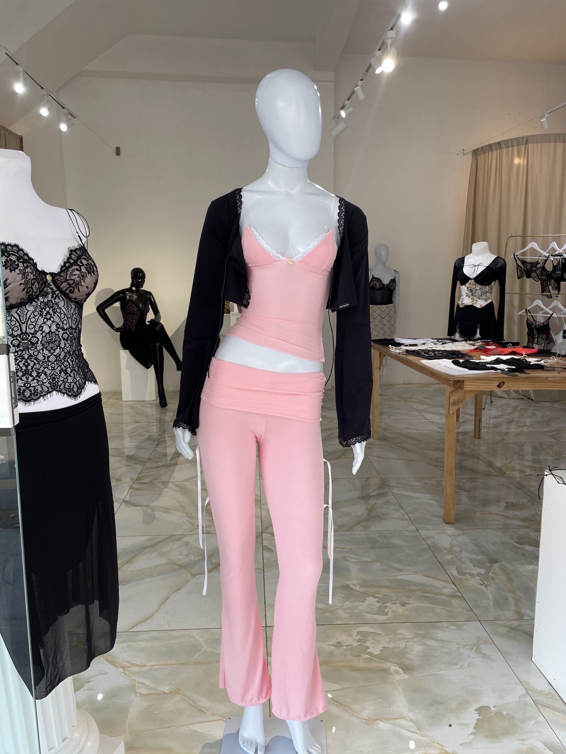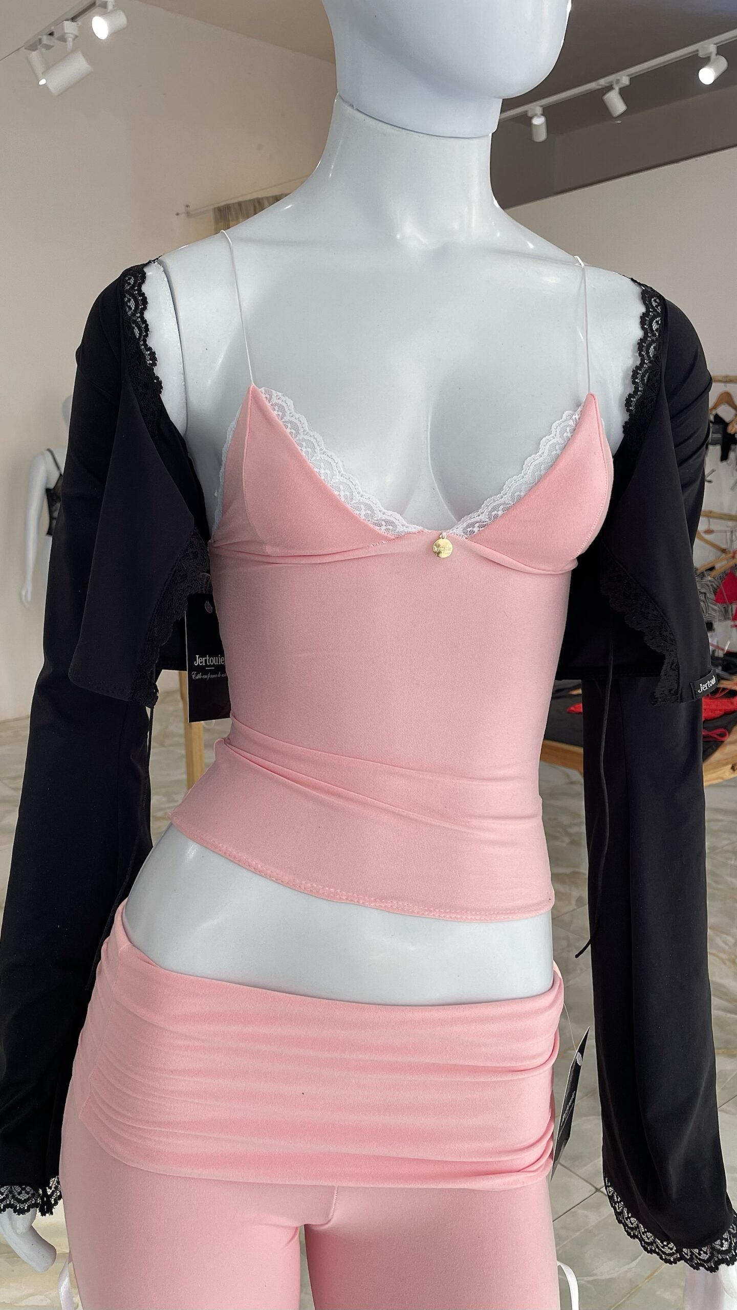 Design Coquette, feito com Tecido Suede Malha toque de algodão com elastano, Calça corte bailarina a altura do cós pode ser regulável ao dobrar a “sainha”. Blusa Coquette com detalhe de renda e alça fina de cetim sem elastano