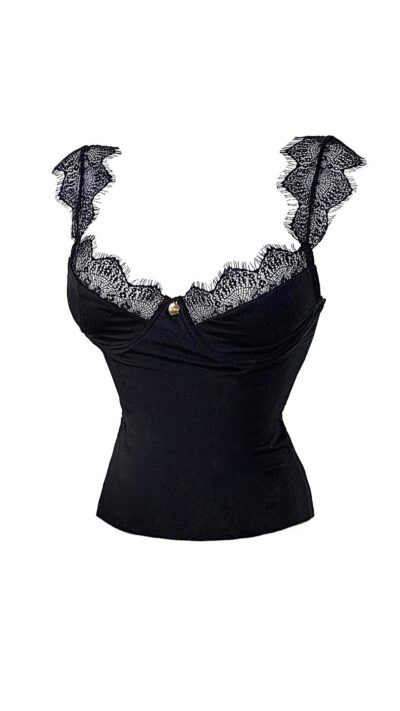Design Geoire, a Blusa com aro meia-taça em tecido microfibra com poliamida, toque macio e confortável. Região do busto forro dublo, detalhe de Renda acima do busto com transparência.
