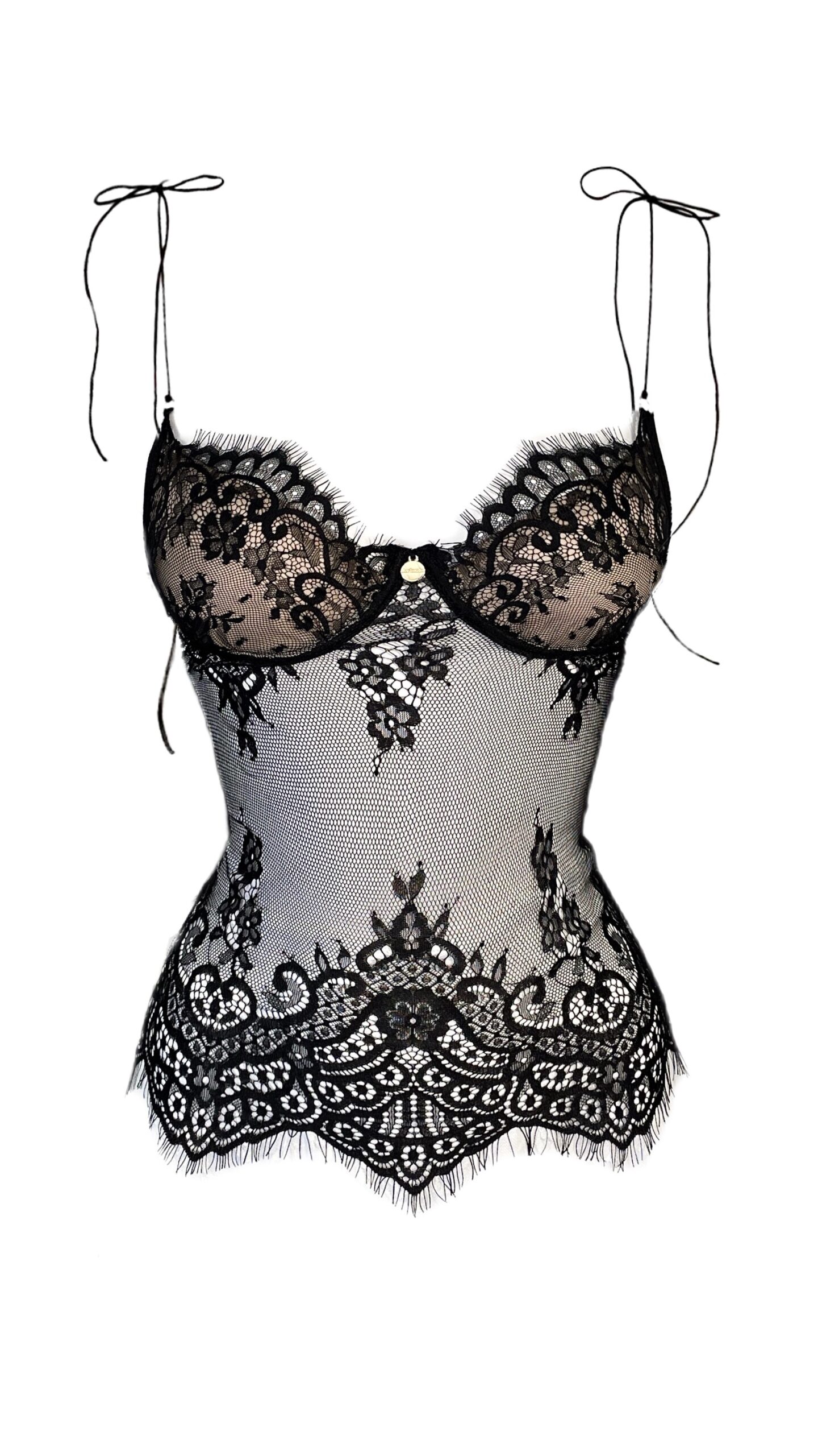 A Blusa acompanha aro meia-taça e forro no busto (bege). Renda sem elastano, modelando no corpo ao vestir.