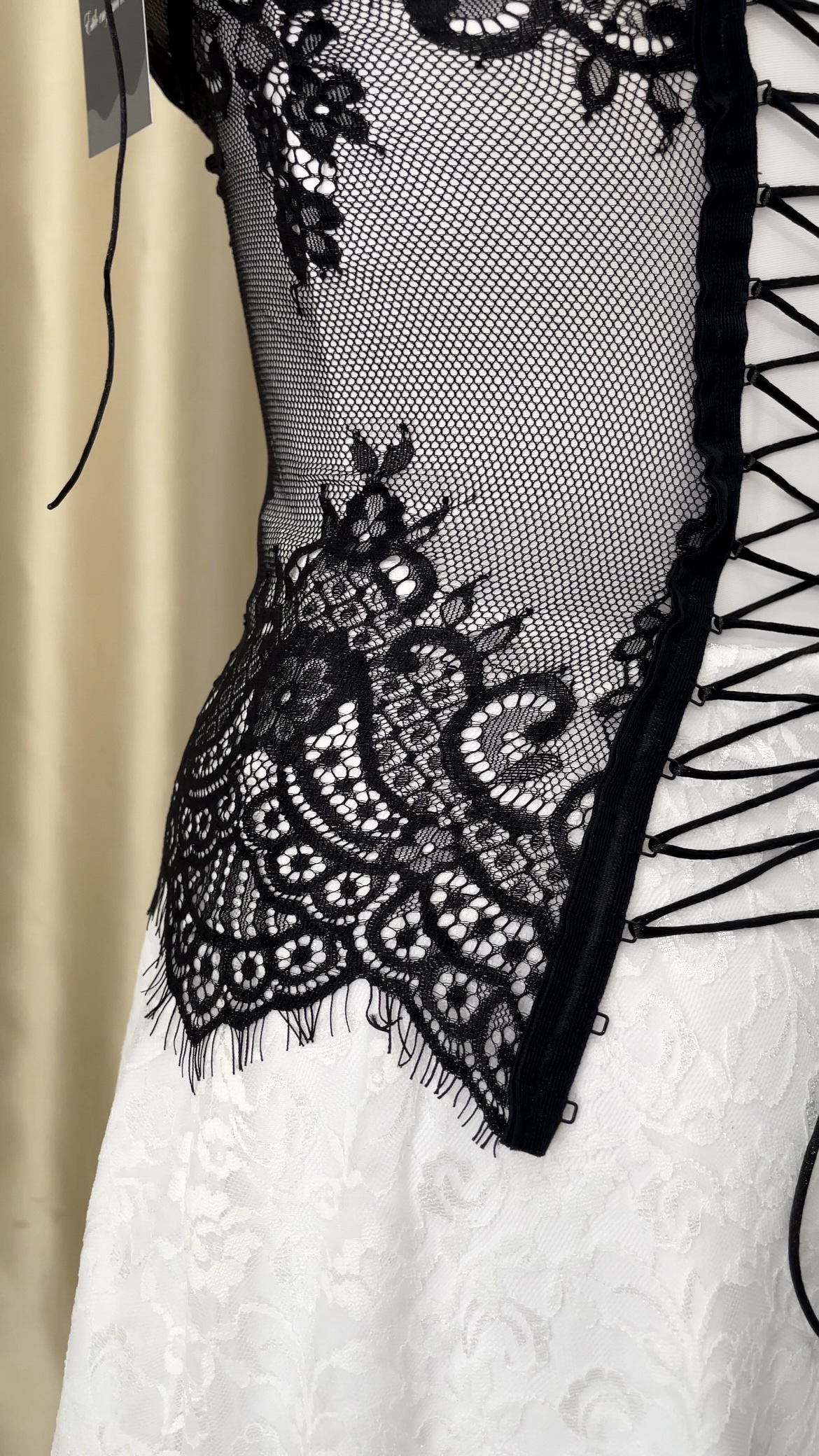 Para iniciar, com a peça vestida, comece apertando os fios nas costas (na altura do aro meia-taça para sustentar o busto) Aperte os fios até a altura da cintura, no final da blusa NÃO aperte para a blusa ficar solta e também não subir.