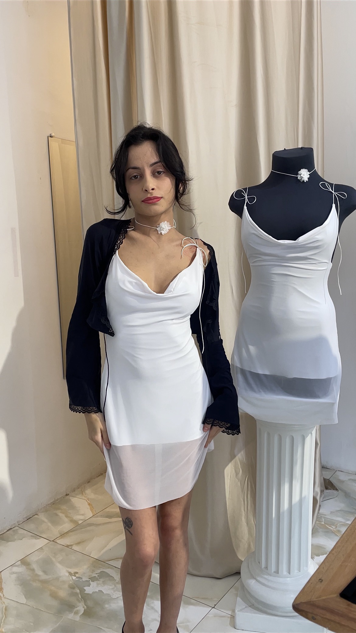 Design Tule, feito com tecido de microfibra com poliamida e forrado de tule, leve para dias de verão. Alça fina de cetim regulável, pode escolher a altura do decote